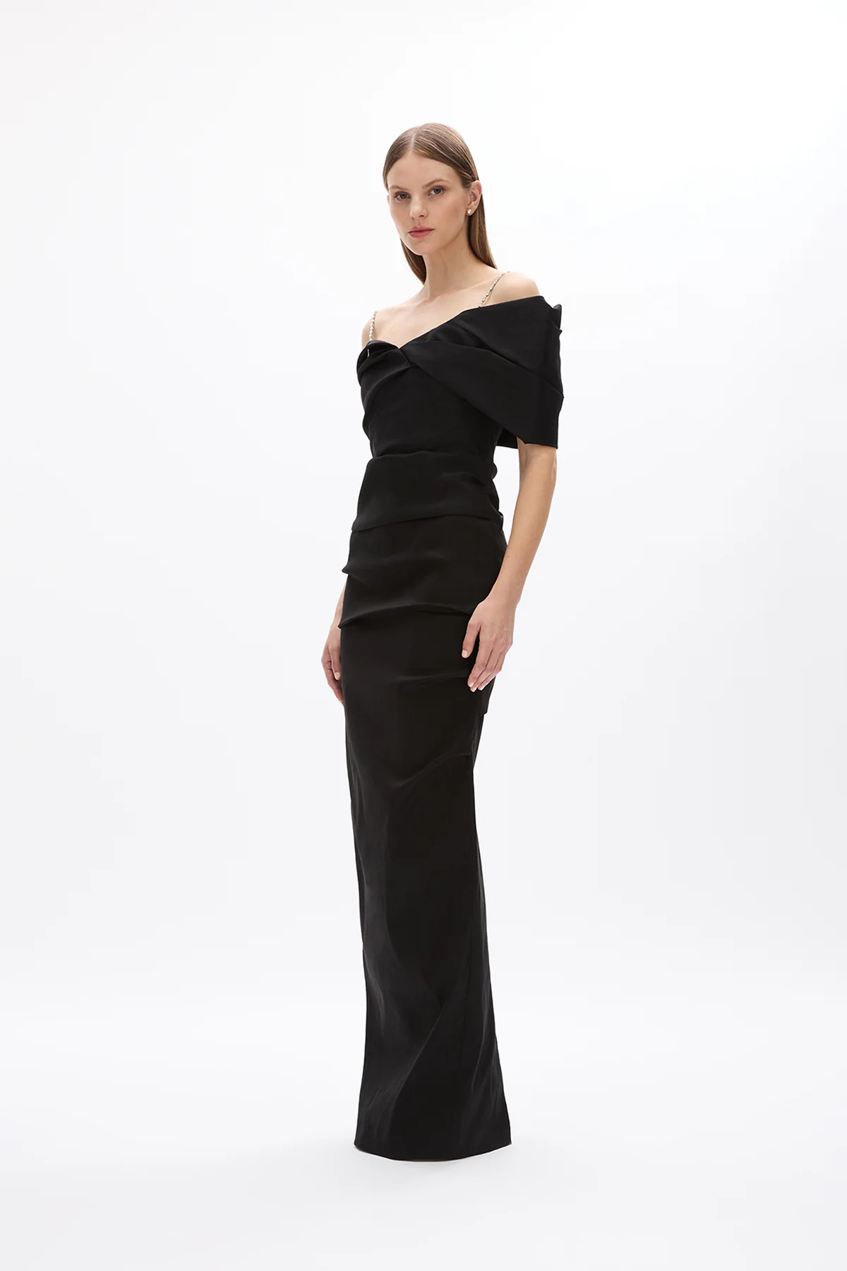 Inspired by the classic gown, the Dahli Gown embodies timeless elegance and sophistication, falling to a floor-grazing length with ruched taffeta. Complete with subtly embellished straps and a heart-shaped neckline.
