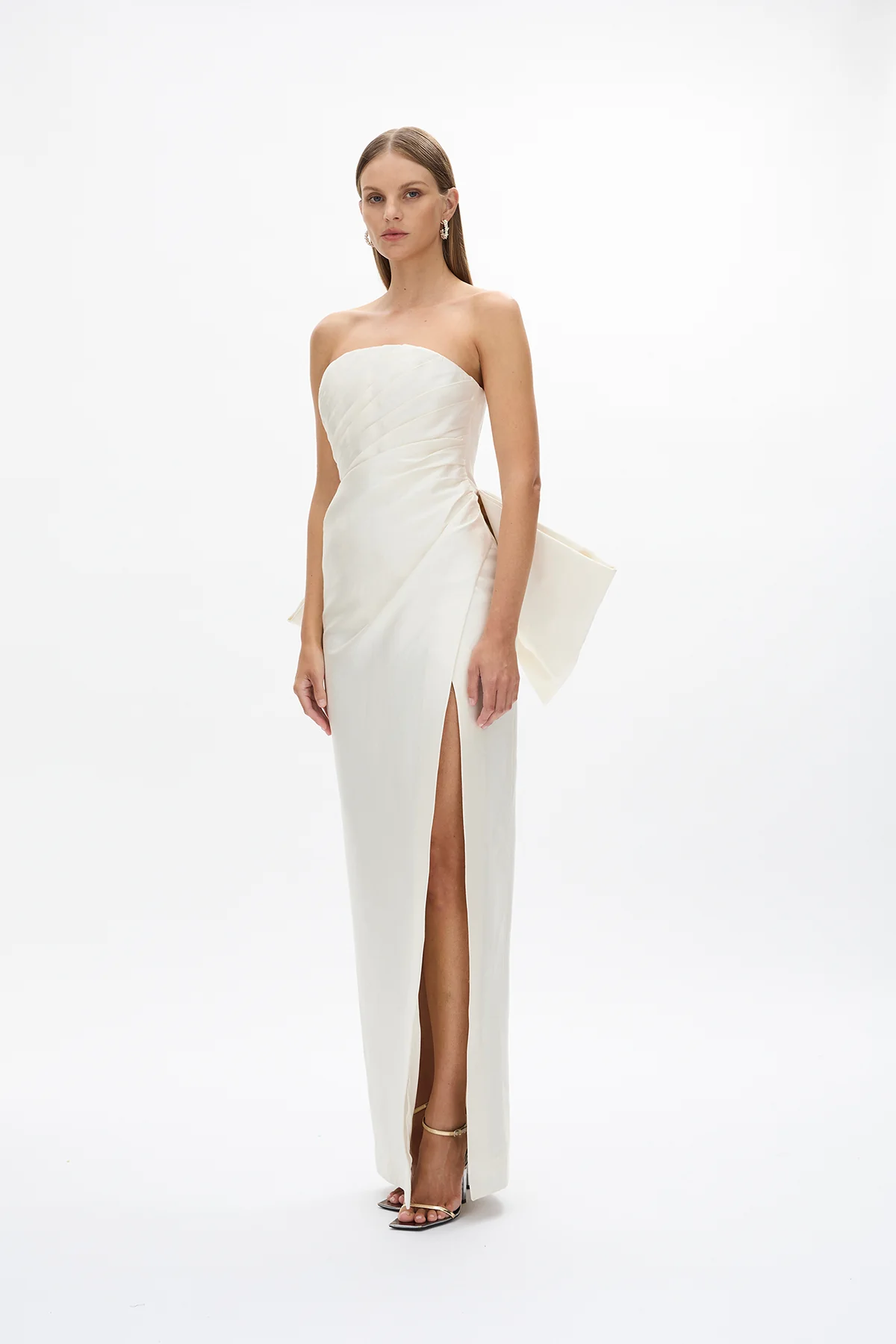 The Emmy is a detail-rich gown designed consciously for the female form with thoughtful draping and an exaggerated bow detailing at the back of the dress. Complete with internal boning, cinching at the waist and a thigh split. Designed for the modern woman with timeless style.