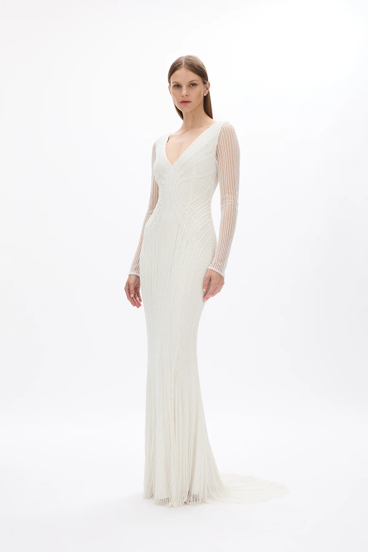 A timeless silhouette, the Lyla is a luxurious bridal gown that is entirely hand beaded throughout. This style features a soft V at the front and back of the gown, full-length sleeves, and soft tulle fabric that falls into a slim fitting shape, complimenting the feminine form.