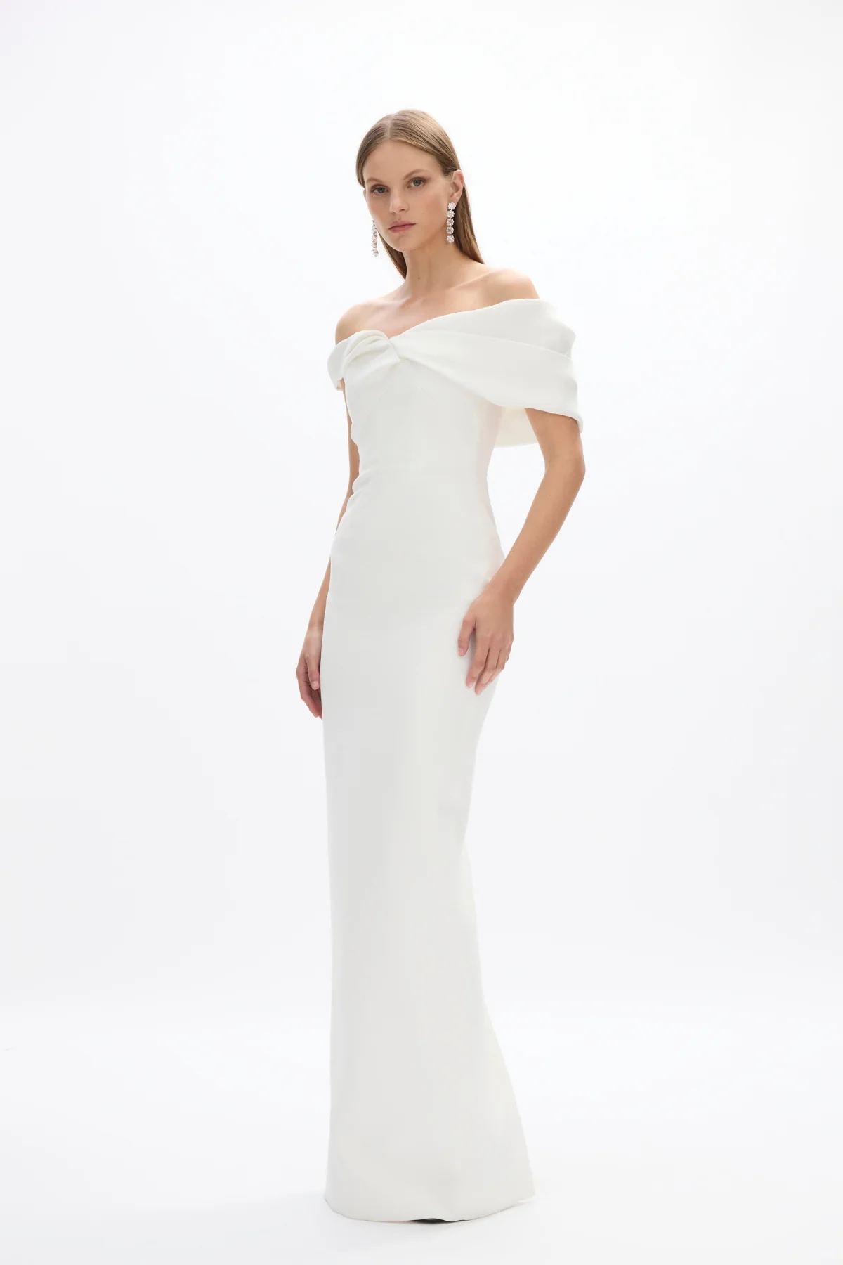 A classic silhouette crafted with a soft sweetheart neckline and off-the-shoulder straps falling to a full length silhouette. Detailed with signature Rachel Gilbert craftsmanship with internal corsetry to create waist definition and create a soft hour-glass shape.