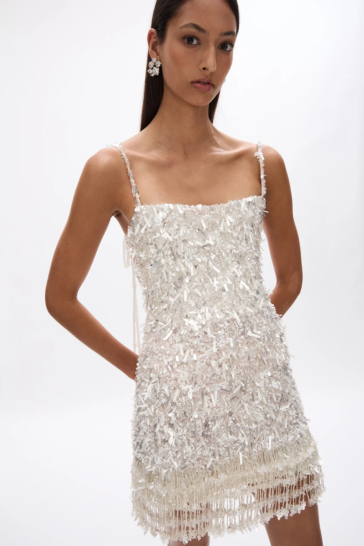 The Posie Mini in Ivory is designed to captivate with movement, light, and sculpted femininity. Densely adorned with hand-applied metallic sequins, this form-fitting silhouette shimmers from every angle, while a cascading beaded fringe hemline adds playful texture and modern glamour. Finished with slim self-tie straps and signature internal corsetry, the Posie Mini is crafted for unforgettable evenings and special celebrations.